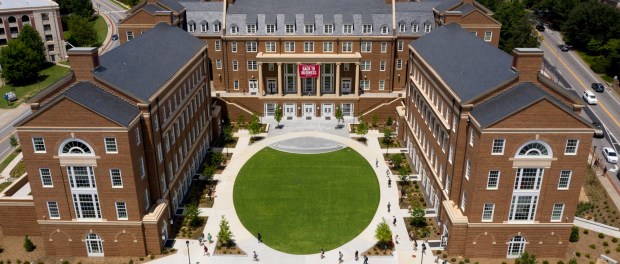 Overhead aerials of the Terry College of Business Learning Community with all six buildings completed and in operation on the first day of fall semester.