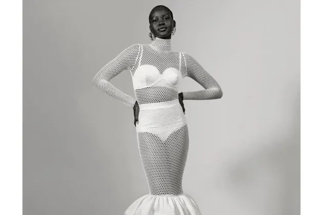 The campaign is full of smiles and unposed hand gestures, as if the women were captured in the middle of a lively conversation. Emeline Hoareau, one of the curvier models in the show, approximates a rear double-bicep pose in her backless dress with a tiered skirt.